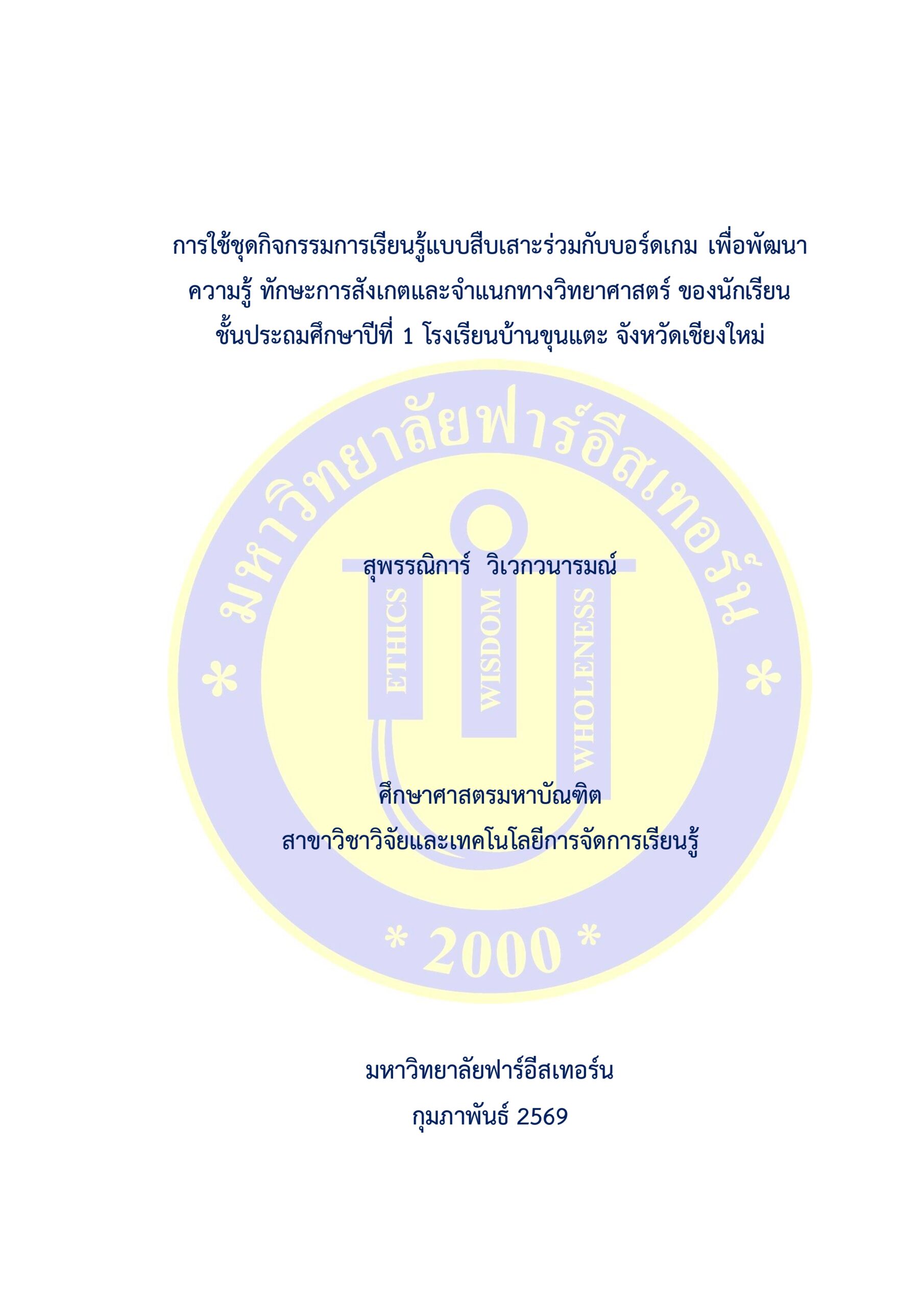 | ชื่อเรื่องการค้นคว้าอิสระ | การใช้ชุดกิจกรรมการเรียนรู้แบบสืบเสาะร่วมกับบอร์ดเกม เพื่อพัฒนาความรู้ ทักษะการสังเกตและจำแนกทางวิทยาศาสตร์ ของนักเรียน ชั้นประถมศึกษาปีที่ 1 โรงเรียนบ้านขุนแตะ จังหวัดเชียงใหม่ |