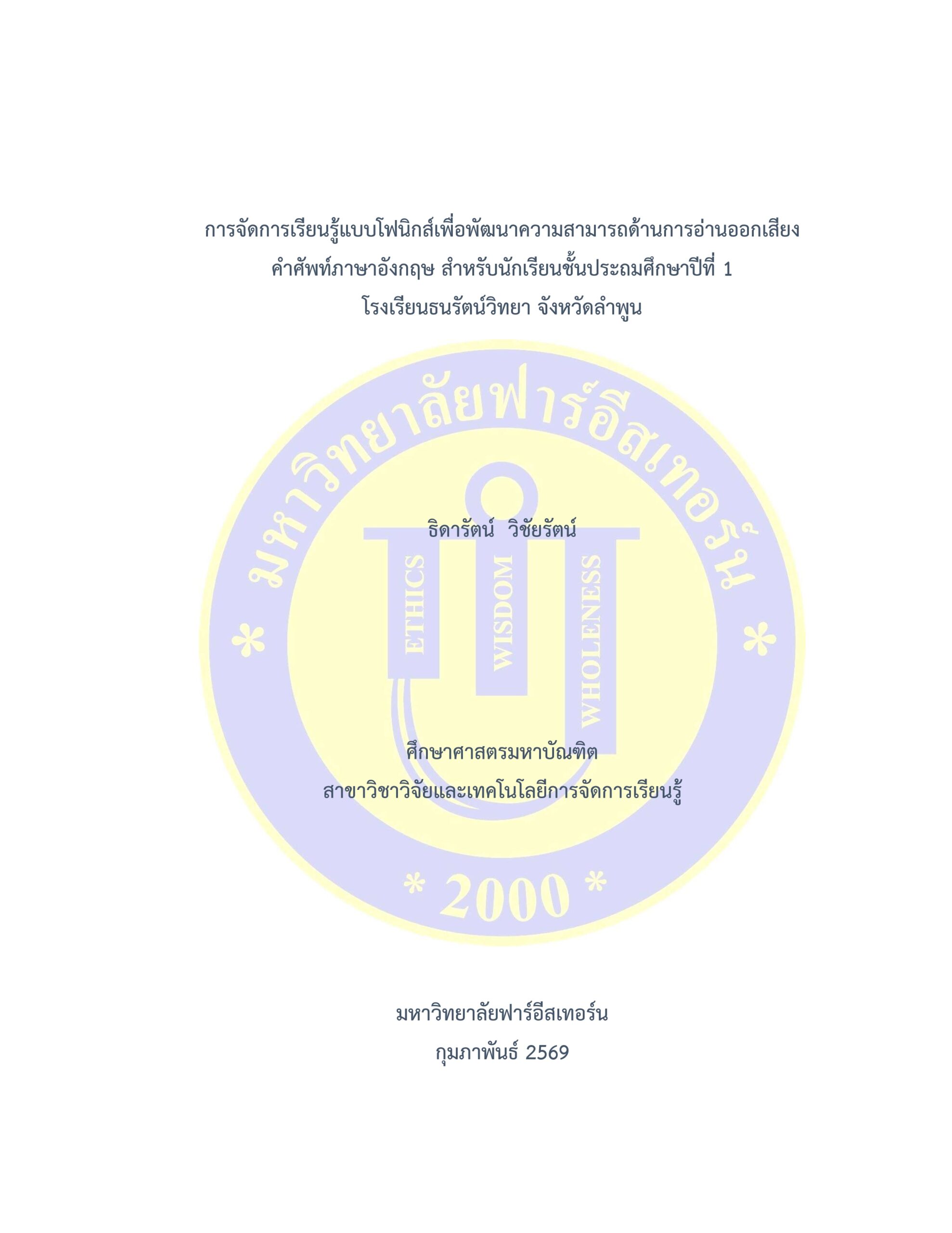 | ชื่อเรื่องการค้นคว้าอิสระ | การจัดการเรียนรู้แบบโฟนิกส์เพื่อพัฒนาความสามารถด้านการอ่านออกเสียงคำศัพท์ภาษาอังกฤษ สำหรับนักเรียนชั้นประถมศึกษาปีที่ 1 โรงเรียนธนรัตน์วิทยา จังหวัดลำพูน |