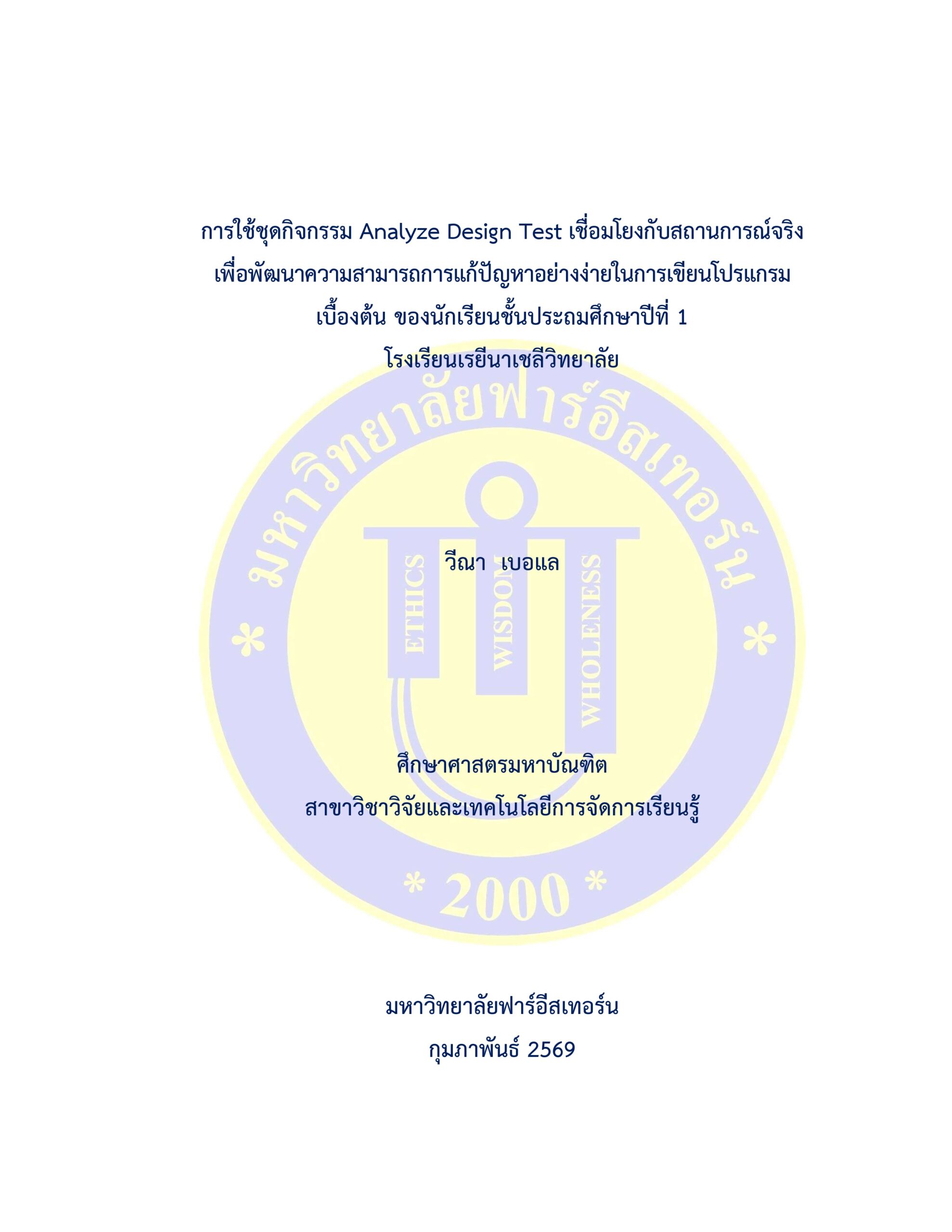 ชื่อเรื่องการค้นคว้าอิสระการใช้ชุดกิจกรรม Analyze Design Test เชื่อมโยงกับสถานการณ์จริงเพื่อพัฒนาความสามารถการแก้ปัญหาอย่างง่ายในการเขียนโปรแกรม เบื้องต้น ของนักเรียนชั้นประถมศึกษาปีที่ 1 โรงเรียนเรยีนาเชลีวิทยาลัย