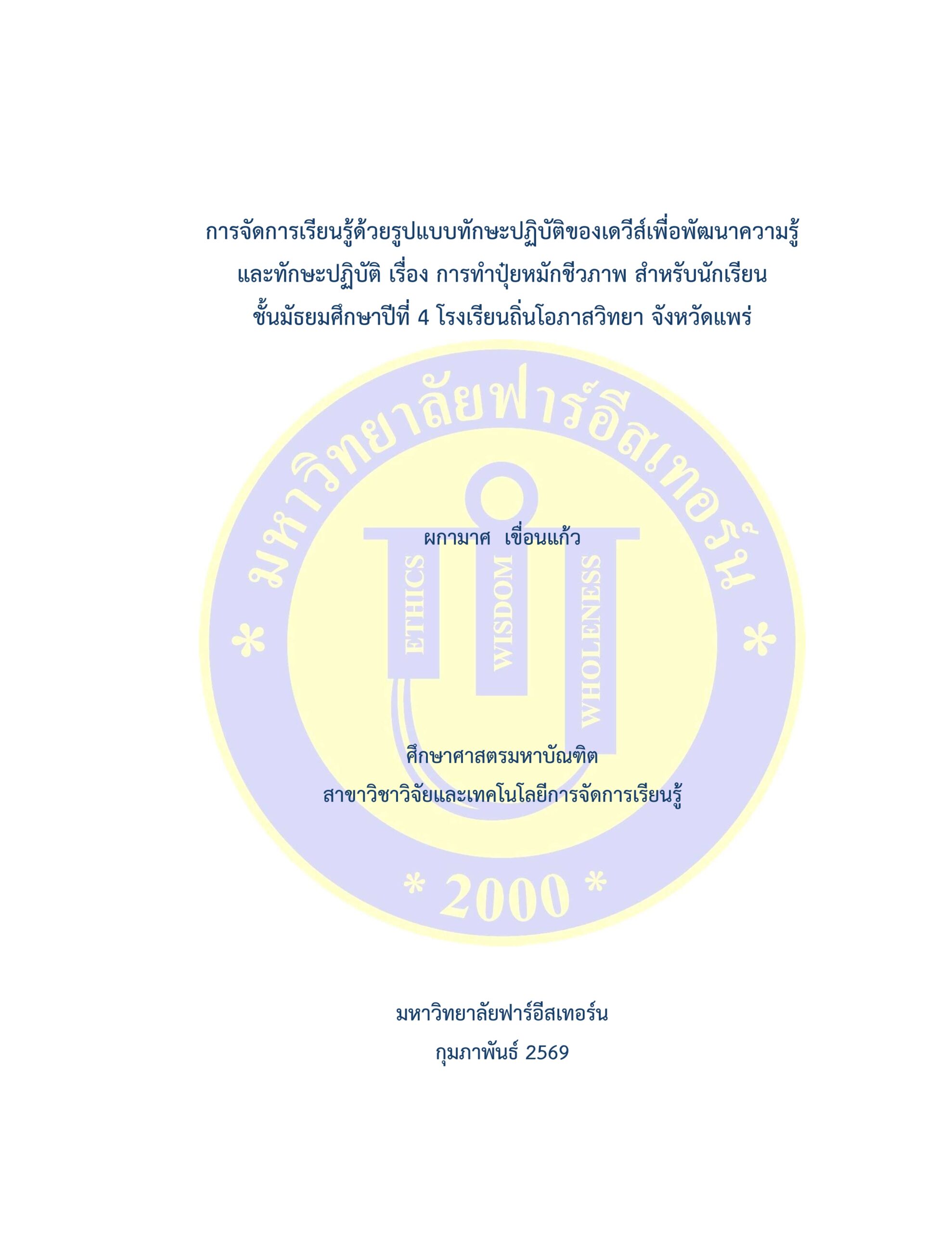 ชื่อเรื่องการค้นคว้าอิสระการจัดการเรียนรู้ด้วยรูปแบบทักษะปฏิบัติของเดวีส์เพื่อพัฒนาความรู้ และทักษะปฏิบัติ เรื่อง การทำปุ๋ยหมักชีวภาพ สำหรับนักเรียนชั้นมัธยมศึกษาปีที่ 4 โรงเรียนถิ่นโอภาสวิทยา จังหวัดแพร่