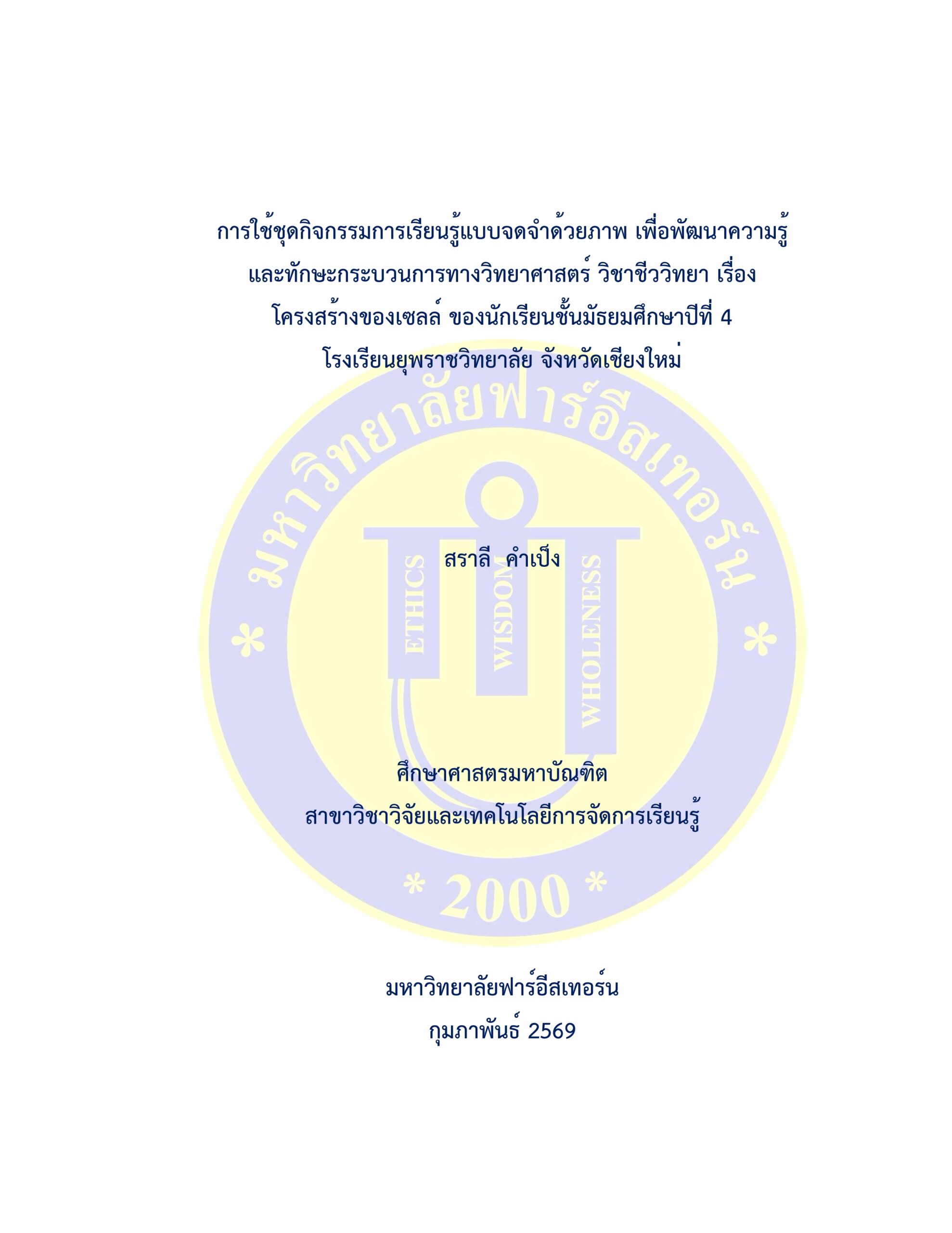 การศึกษาครั้งนี้มีวัตถุประสงค์เพื่อ (1) เพื่อสร้างชุดกิจกรรมการเรียนรู้แบบจดจำด้วยภาพ เรื่อง โครงสร้างของเซลล์ (2) เพื่อพัฒนาความรู้ เรื่อง โครงสร้างของเซลล์ และ (3) เพื่อศึกษาทักษะกระบวนการทางวิทยาศาสตร์ของนักเรียนชั้นมัธยมศึกษาปีที่ 4 โรงเรียนยุพราชวิทยาลัย จังหวัดเชียงใหม่ จากการจัดกระบวนการเรียนรู้ด้วยชุดกิจกรรมการเรียนรู้แบบจดจำด้วยภาพ กลุ่มตัวอย่างที่ใช้ในการศึกษาครั้งนี้ คือนักเรียนชั้นมัธยมศึกษาปีที่ 4 ภาคเรียนที่ 2 ปีการศึกษา 2568 โรงเรียนยุพราชวิทยาลัย จำนวน 1 ห้อง 35 คน ได้มาด้วยการสุ่มตัวอย่างแบบกลุ่ม รูปแบบงานวิจัยเชิงปฏิบัติการประยุกต์ โดยเครื่องมือวิจัยที่ใช้ศึกษา ได้แก่ (1) ชุดกิจกรรมการเรียนรู้แบบจดจำด้วยภาพ เรื่อง โครงสร้างของเซลล์ (2) แบบทดสอบวัดความรู้แบบปรนัย และ (3) แบบวัดทักษะกระบวนการทางวิทยาศาสตร์แบบอัตนัย วิเคราะห์ข้อมูลโดยใช้ ร้อยละ ค่าเฉลี่ย ฐานนิยม ส่วนเบี่ยงเบนมาตรฐาน สัมประสิทธิ์การแปรผัน t-test (Paired Two Sample for Means) และ Z-test (One Sample Test for Proportion)